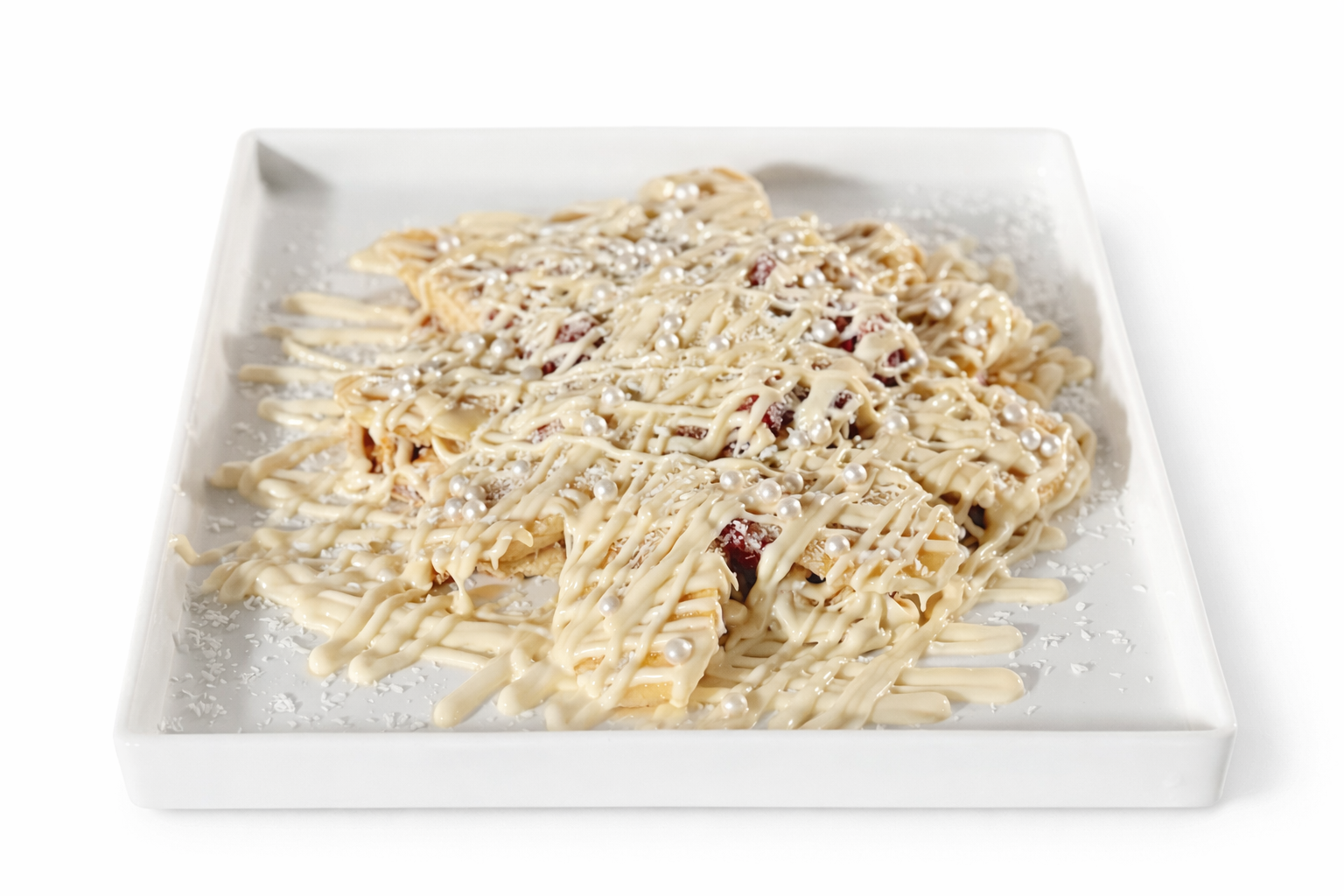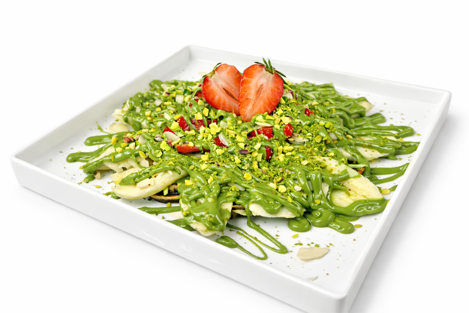 Muz, çilek, File badem, fıstık çikolatası, dibine sütlü çikolata, üzerine dilim çilek ve kırık antep fıstığı