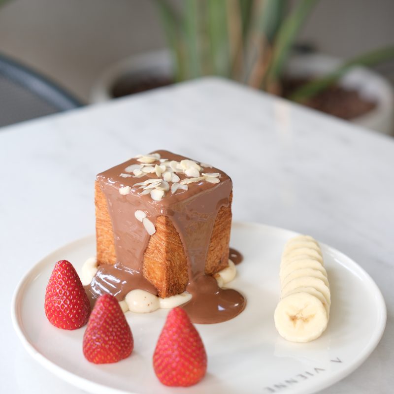 90 gr tereyağlı kruvasan, arasında fransız kreması mevsim meyveleri (çilek, muz), üzerine belçika çikolatası ile kaplanıp beyaz çikolata ve antep fıstığı ile süslenerek servis edilir.