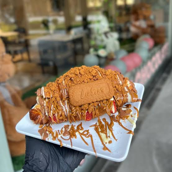 90 gr tereyağlı kruvasan, arasında fransız kreması lotus biscuit parçaları üzerine belçika çikolatası
