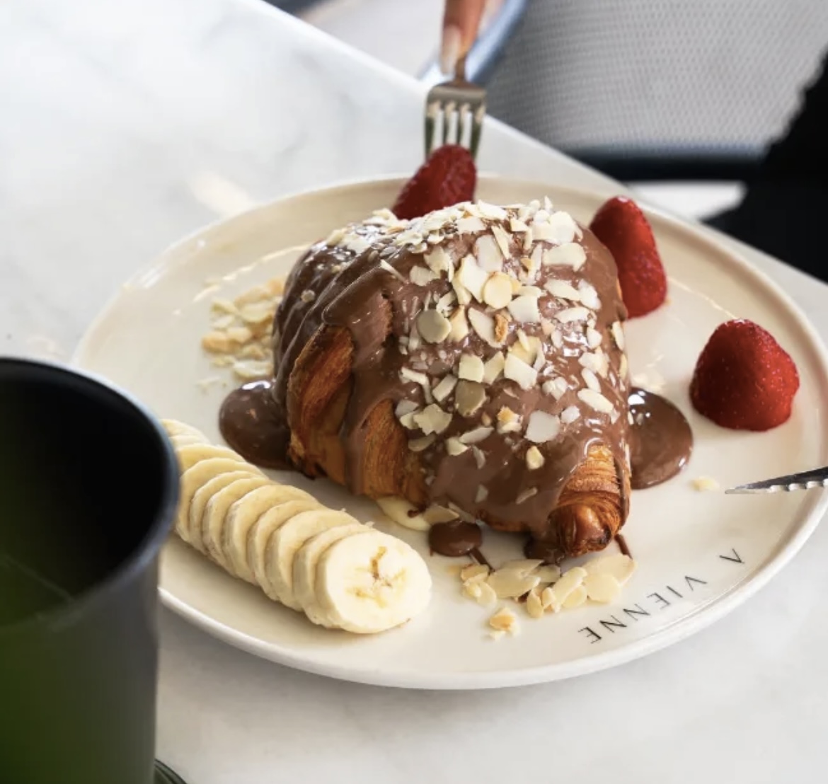 90gr tereyağlı kruvasan içerisine pastacı kreması dilimlenmiş çilek ve muz. Üzerine belçika çikolatası ile kaplanıp beyaz çikolata ve antep fıstığı ile süslenerek servis edilir.